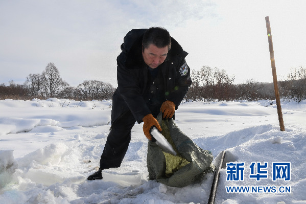 2月14日,白玉華在河溝中取冰。前幾天站內(nèi)柴油發(fā)電機出現(xiàn)故障,不能抽水,用水只能靠鑿冰化水。新華社記者 劉磊 攝