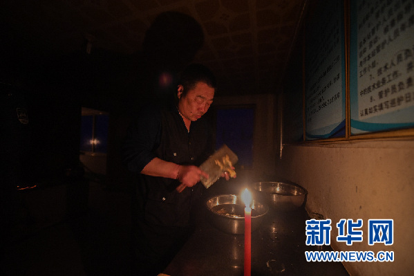 燭光搖曳,白玉華一一清洗凍白菜、土豆和鮮肉,這是他年夜飯的所有食材。這幾天喝水成了問題,用的水是他從20公里之外的河溝中鑿取的冰塊。兩天前,站上的柴油發(fā)電機壞了,不能抽取井水。大雪封山,車行困難,機器無法維修?!斑@機器也知道過年給自己‘放假’?!卑子袢A苦笑地?fù)u搖頭。