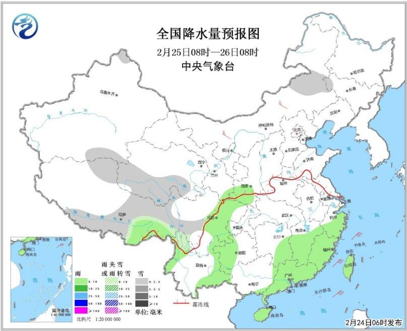 25日08時(shí)至26日08時(shí),青藏高原中部和南部等地有小雪或雨夾雪;西北地區(qū)東南部、四川盆地、江南南部、華南中東部、云南西北部和東部、海南島、臺(tái)灣等地有小雨或陣雨。內(nèi)蒙古中西部等地有4~5級(jí)風(fēng)。東海大部、臺(tái)灣海峽等海域有6~7級(jí)、陣風(fēng)8級(jí)的東北風(fēng)。