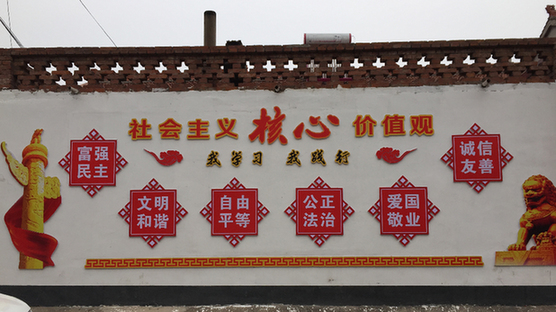 圖為南石村委辦公樓對(duì)面引人注目的標(biāo)語。新華網(wǎng)記者 陳麗 攝