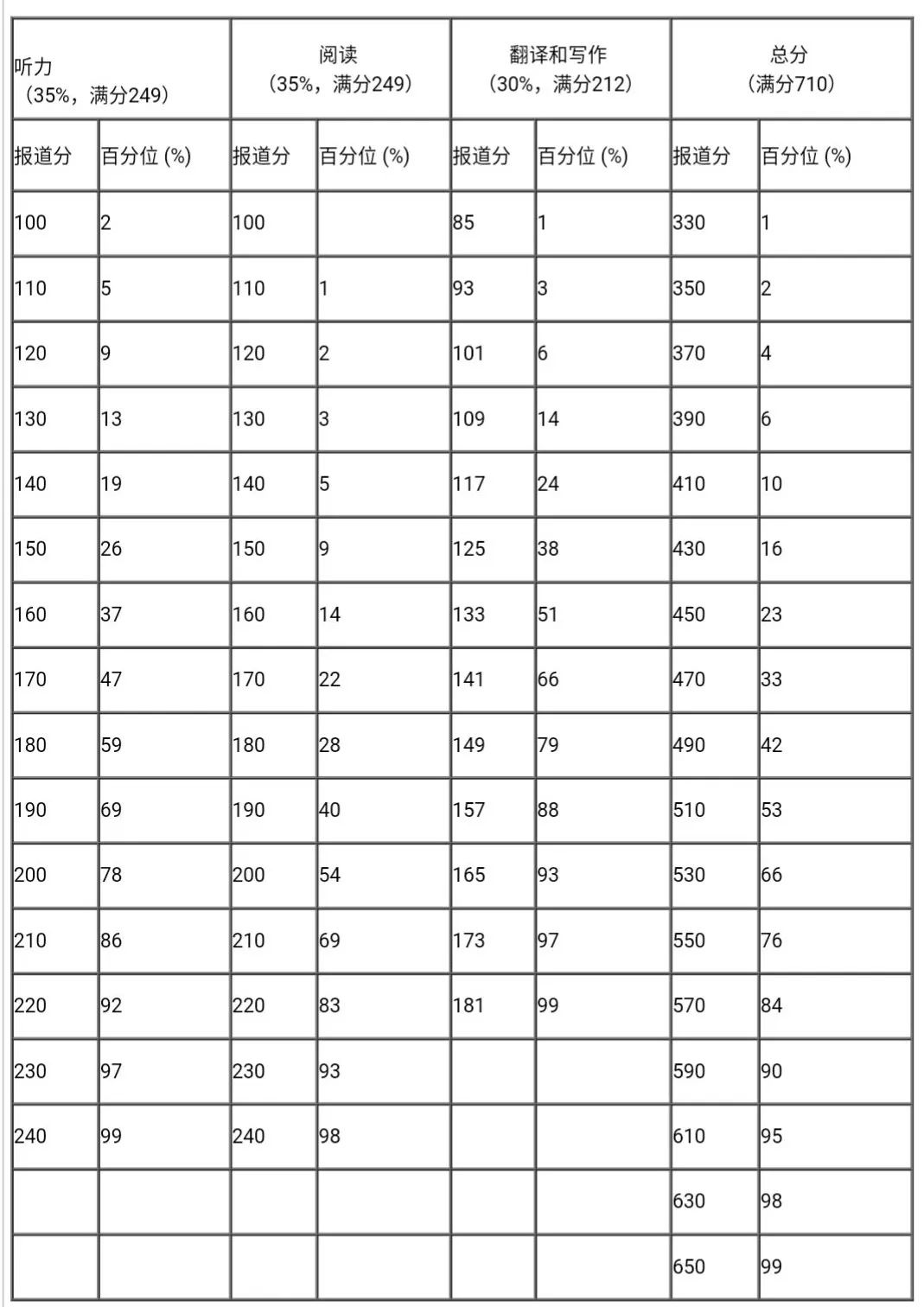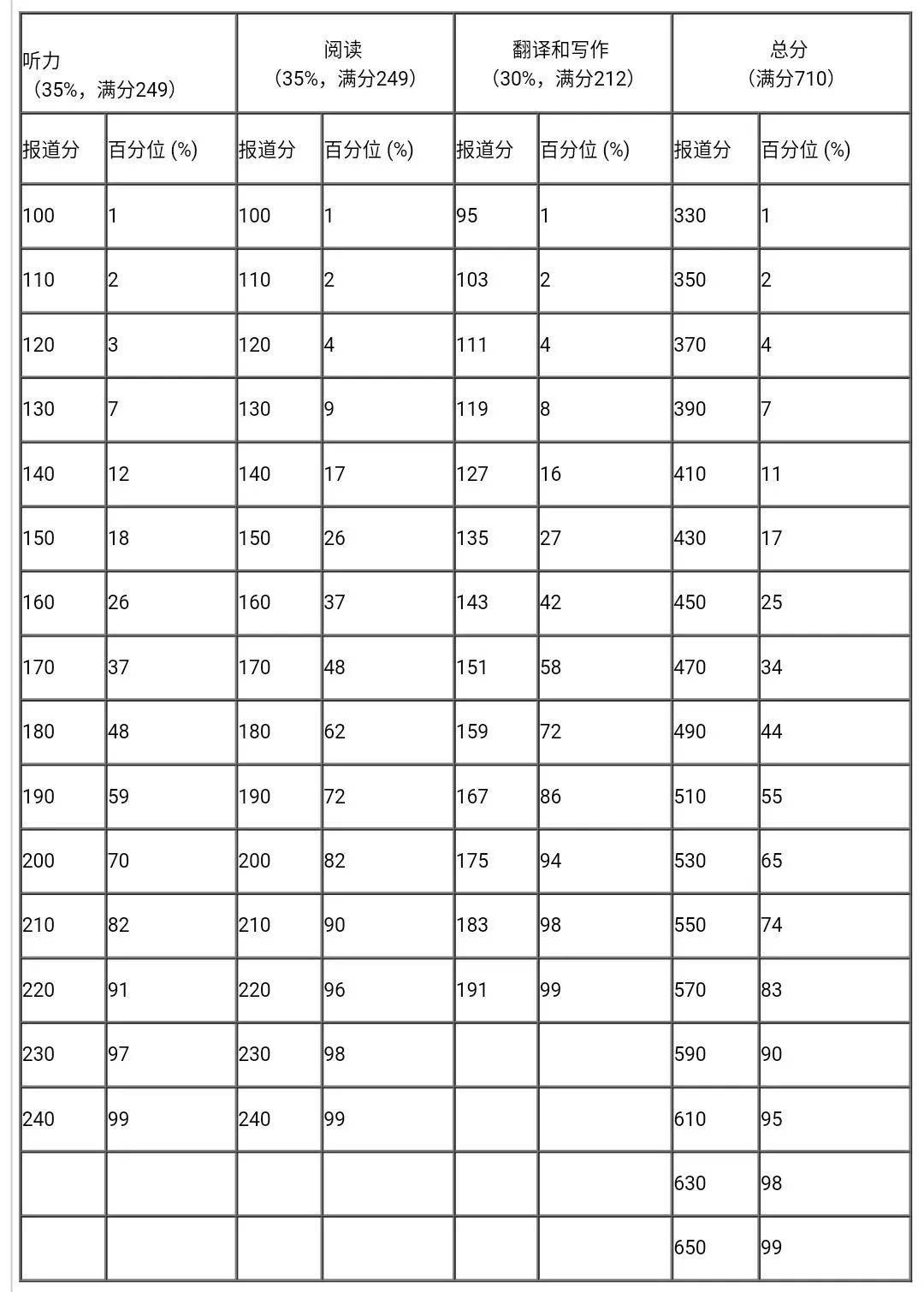 每次考試等值后的卷面分?jǐn)?shù)都參照常模轉(zhuǎn)換為報道分。四、六級考試報道總分為710分,計算公式為: