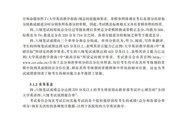 中國青年報(ID:zqbcyol)注意到,《全國大學(xué)生英語四、六級考試大綱》(2016修訂版)顯示,“考生的四級筆試成績達到425分及以上,表明其語言能力已達到《大學(xué)英語教學(xué)指南》中‘基礎(chǔ)目標(biāo)’所設(shè)定的教學(xué)要求;考生的六級筆試成績達到425分及以上,表明其語言能力已達到《大學(xué)英語教學(xué)指南》中‘提高目標(biāo)’所設(shè)定的教學(xué)要求?!?/p>