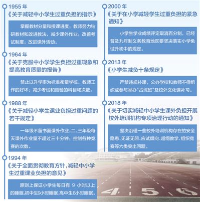 為什么會(huì)這樣?其實(shí),自1955年7月教育部發(fā)出新中國第一個(gè)“減負(fù)令”——《關(guān)于減輕中小學(xué)生過重負(fù)擔(dān)的指示》以來,60余年間我國中央及地方相關(guān)部門出臺(tái)的學(xué)生“減負(fù)令”多達(dá)上百道,圍繞學(xué)習(xí)時(shí)間、考核方式、教材內(nèi)容、課外活動(dòng)、教師水平、學(xué)校領(lǐng)導(dǎo)等方面做出了一系列細(xì)致嚴(yán)謹(jǐn)?shù)囊?guī)定。