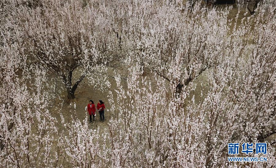 3月28日,游客在敦煌鳴沙山下的李廣杏園內(nèi)賞花。近日,甘肅省敦煌市鳴沙山下8000多畝李廣杏花競(jìng)相開(kāi)放,吸引了眾多游客和市民踏青賞花。 新華社記者陳斌攝