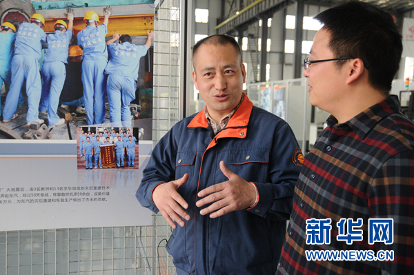胡明華(左)與團(tuán)隊(duì)成員一起向記者回憶2008年他們?cè)鷸|汽災(zāi)后重建工作的情形。新華網(wǎng) 聶晨靜 攝