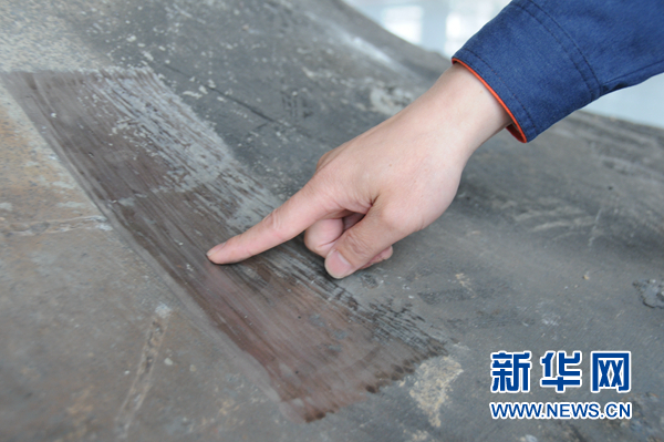 胡明華為記者展示用自動(dòng)編程自適應(yīng)機(jī)器人自動(dòng)打磨系統(tǒng)打磨的鑄鍛件表面部分。新華網(wǎng) 聶晨靜 攝