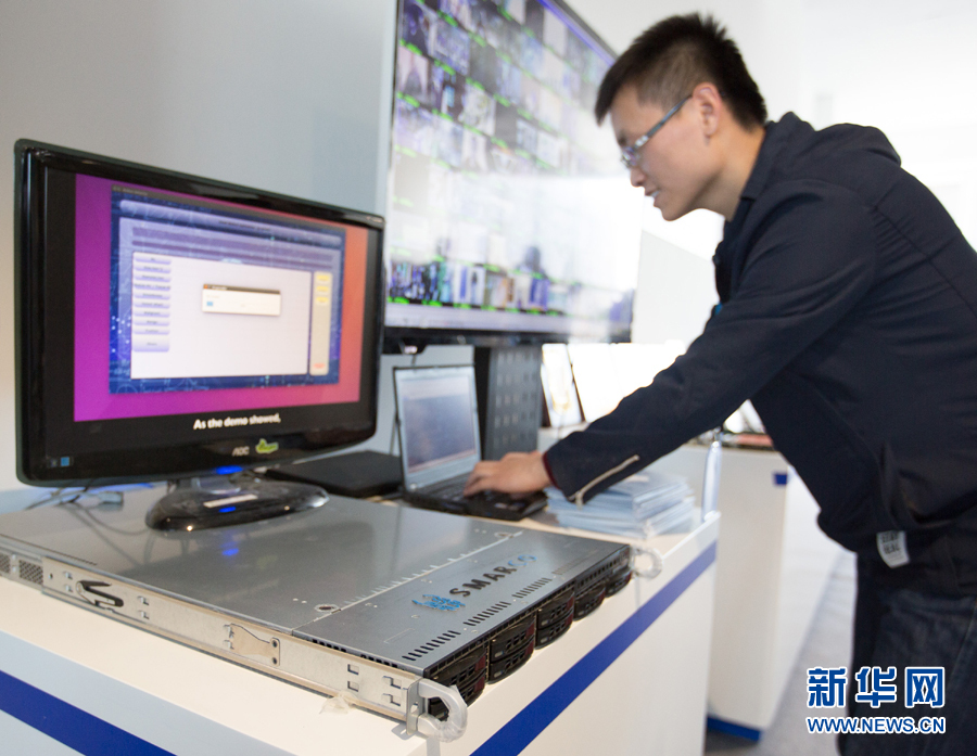 在北京智能計算產(chǎn)業(yè)研究院舉行的發(fā)布會上,工作人員在現(xiàn)場演示高通量人工智能一體機的實際應用(2017年12月6日攝)。新華社記者 金立旺 攝