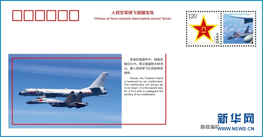 紀(jì)念封、宣傳片所用戰(zhàn)機巡航影像,均為人民空軍飛行員執(zhí)行繞島巡航任務(wù)中航拍的。“寶島在祖國懷中,祖國在我們心中。捍衛(wèi)祖國的大好河山,是人民空軍飛行員的神圣使命?!保访都o(jì)念封傳遞了空軍飛行員這一共同心聲。