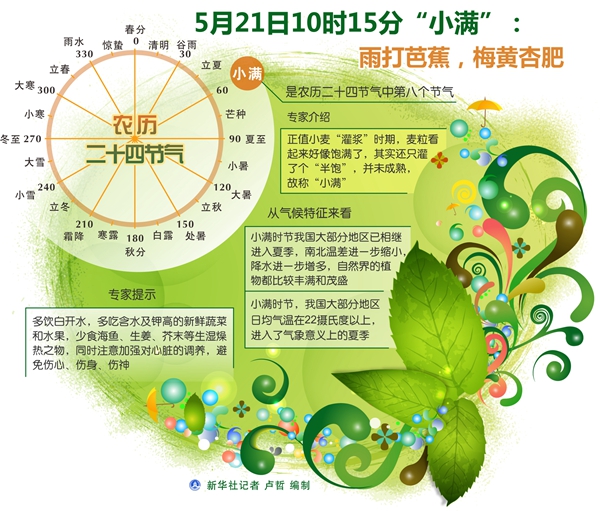北京時間5月21日10時15分將迎來“小滿”節(jié)氣。逢此時節(jié),夜鶯輕啼,雨打芭蕉,梅黃杏肥。從氣候特征來看,小滿時節(jié)我國大部分地區(qū)已相繼進入夏季,南北溫差進一步縮小,降水進一步增多,自然界的植物都比較豐滿和茂盛。小滿時節(jié),我國大部分地區(qū)日均氣溫在22攝氏度以上,進入了氣象意義上的夏季。由于氣溫升高很快,人體難以適應,要特別注意養(yǎng)生調(diào)節(jié)。>>