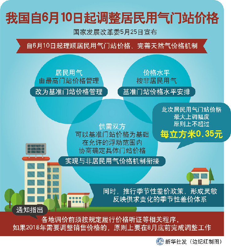 國家發(fā)展改革委5月25日宣布,自6月10日起理順居民用氣門站價(jià)格、完善價(jià)格機(jī)制。這是我國自2010年以來首次調(diào)整居民用氣門站價(jià)格,最大上調(diào)幅度原則上不超過每立方米0.35元。