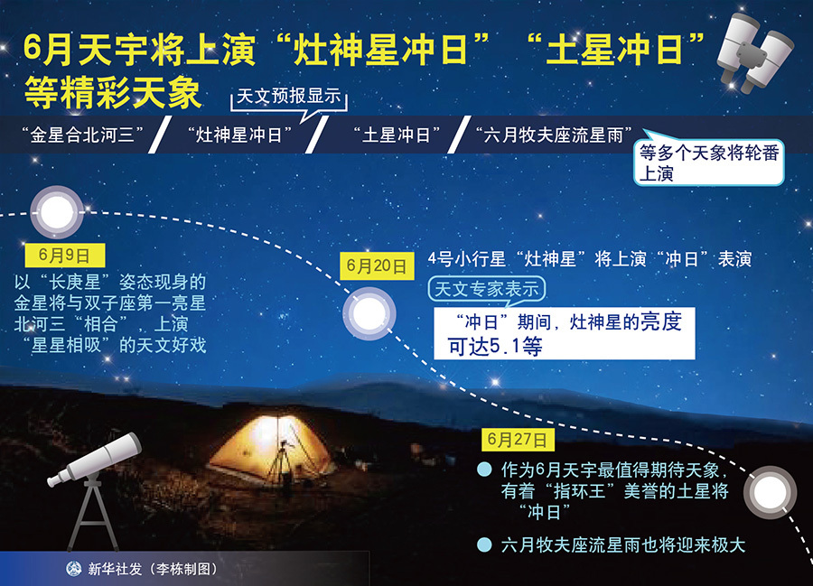 6月夜空,天象精彩。6月9日,以“長庚星”姿態(tài)現(xiàn)身的金星將與雙子座第一亮星北河三“相合”,上演“星星相吸”的天文好戲。此外,4號(hào)小行星“灶神星”6月20日將上演“沖日”表演;有著“指環(huán)王”美譽(yù)的土星將于6月27日“沖日”;巧合的是,六月牧夫座流星雨也將于27日迎來極大。