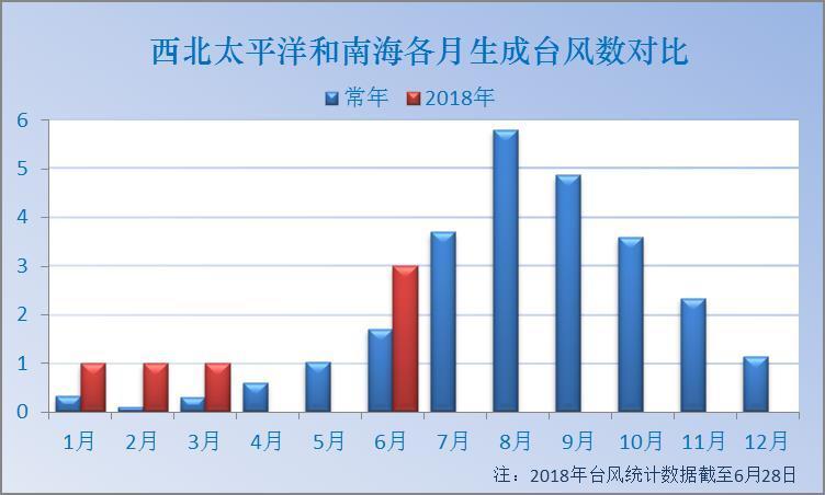 到目前為止,今年西北太平洋和南海已經有6個臺風生成,1個臺風登陸我國,常年1-6月平均會生成4.1個臺風,登陸0.63個。實際上今年無論生成臺風個數(shù)還是登陸個數(shù)都比常年平均偏多。