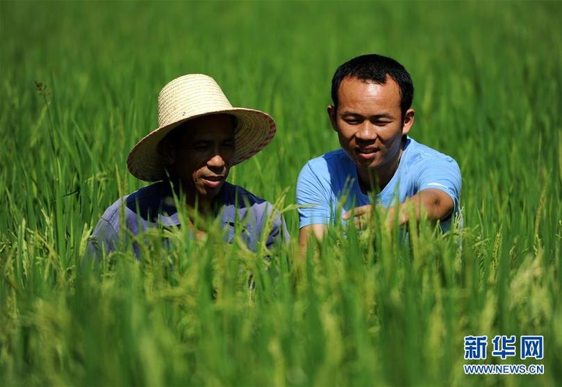 在江西永新縣三灣鄉(xiāng)三灣村田西村小組,時任村支部書記的邢鐳(右)和村民劉小林在交流紫稻生長狀況(2013年8月10日攝)。新華社記者周科 攝