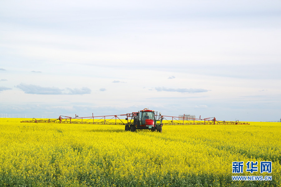 7月21日,一輛自走式噴藥機正在內蒙古呼倫貝爾市謝爾塔拉農(nóng)場對油菜花進行追肥作業(yè)。(新華網(wǎng) 汪亞/攝)