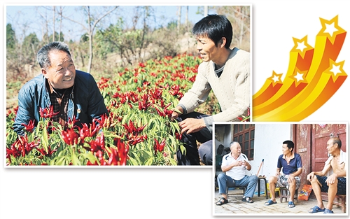 左上圖 張東堂(左)在貧困戶家的辣椒地里查看辣椒長(zhǎng)勢(shì)?!∮蚁聢D 張東堂(左一)來(lái)到貧困戶家中家訪。 經(jīng)濟(jì)日?qǐng)?bào)-中國(guó)經(jīng)濟(jì)網(wǎng)記者 郭靜原攝