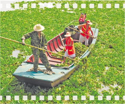 武漢水上管理處清漂隊(duì)在長江漢口段打撈水葫蘆。資料圖片