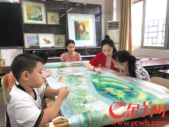 在廣州市荔灣少年宮,一群10歲左右的學生和一位20來歲的女孩正圍坐在一幅自然山水繡布前,女孩兩手時而靈活地穿針引線,時而放下針線,摸摸孩子們的小腦袋,抓起孩子們的小胖手,細心細語地說:“平常我們都用‘直紋直針’繡,如果要繡水紋,就要用‘稀疏針’了,直的地方保持平衡,波浪的地方就要打斜一點點……”