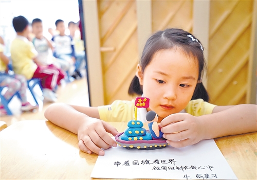 圖⑥ 9月30日,安徽省肥東縣實(shí)驗(yàn)幼兒園御景部開展親子泥塑創(chuàng)意活動(dòng),孩子們用彩泥制作國(guó)旗慶佳節(jié)。許慶勇 攝