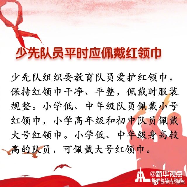 “我們是共產(chǎn)主義接班人,繼承革命先輩的光榮傳統(tǒng),愛(ài)祖國(guó),愛(ài)人民,鮮艷的紅領(lǐng)巾飄揚(yáng)在前胸?!奔t領(lǐng)巾是紅旗的一角,是少年先鋒隊(duì)的象征與標(biāo)志。你是幾歲佩戴上的紅領(lǐng)巾?你對(duì)曾經(jīng)朝夕相伴的紅領(lǐng)巾了解多少?戳圖看詳解↓↓