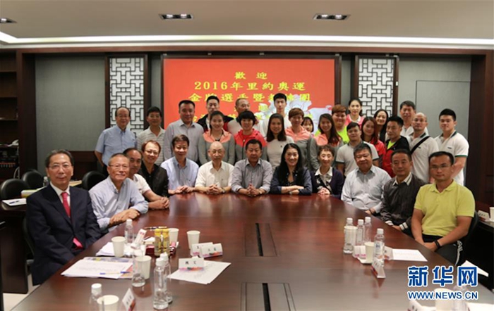2016年,里約奧運(yùn)會大陸金牌選手和教練交流團(tuán)到“中華兩岸經(jīng)貿(mào)投資文化教育協(xié)會”座談交流時合影。協(xié)會由黃紫玉(前排右五)在2009年發(fā)起成立,成為兩岸民間交流的一個平臺(受訪者供圖)。 新華社發(fā)