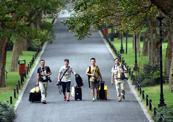圖為金立旺(左一)2016年9月4日在西湖蘇堤準備采訪G20峰會。