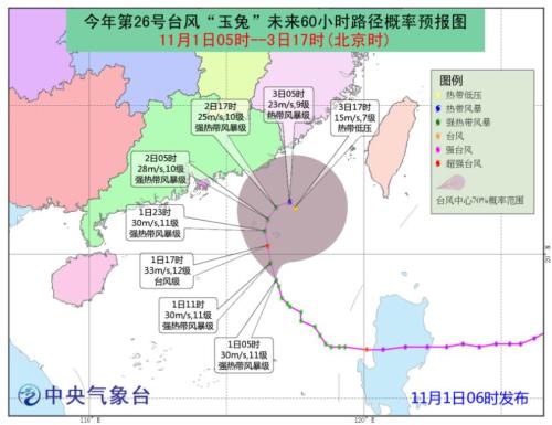 今年第26號(hào)臺(tái)風(fēng)“玉兔”(強(qiáng)熱帶風(fēng)暴級)的中心今天(1日)早晨5點(diǎn)鐘位于東沙島偏南方向約170公里的南海東北部海面上,中心附近最大風(fēng)力11級(30米/秒),中心最低氣壓980百帕。