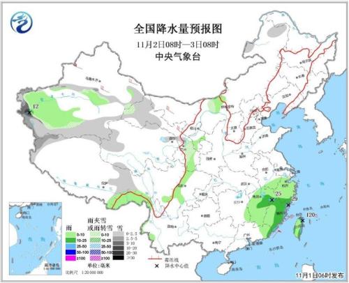 11月1日08時(shí)至2日08時(shí),新疆北部和南疆西部山區(qū)等地部分地區(qū)有中到大雪或雨夾雪,局地有暴雪(10~15毫米)。江南東部、廣東中東部和臺(tái)灣島東北部等地的部分地區(qū)有中到大雨,其中,廣東東部、福建南部和臺(tái)灣等地局地有暴雨或大暴雨(100~110毫米)。新疆北部、南疆盆地、內(nèi)蒙古西部和甘肅西部等地的部分地區(qū)有5~6級及以上風(fēng)。臺(tái)灣海峽、南海東北部海域?qū)⒂?~9級大風(fēng),陣風(fēng)10~11級(見圖3)。