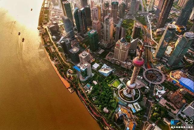 ↑無人機(jī)航拍上海沿江美景,江水被鍍上一層金黃。新華網(wǎng)發(fā) 王正坤 攝