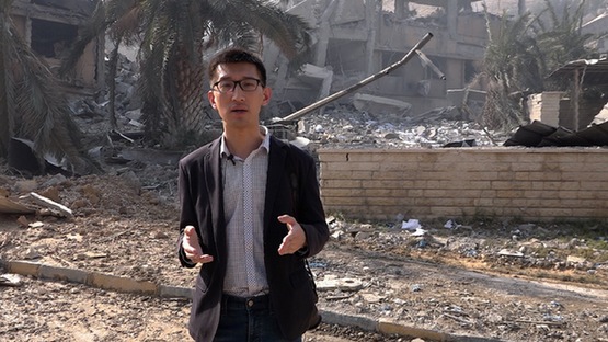 2018年4月14日,鄭一晗在大馬士革東北部的科研中心遭襲現(xiàn)場(chǎng)直播出鏡。