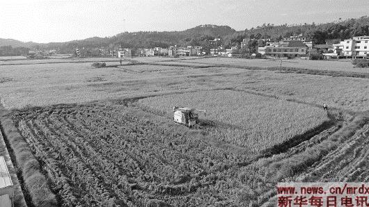 ▲近日,興國縣杰村鄉(xiāng)韶溪村碧桂園水稻種植基地的200畝高標準示范農(nóng)田正在實施機械化收割。