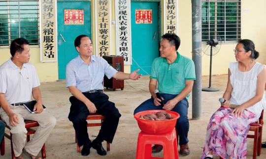 海南省委書記、省人大常委會主任劉賜貴(左二)在澄邁縣橋頭地瓜種植基地與當(dāng)?shù)馗扇鹤?李英挺攝