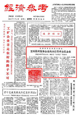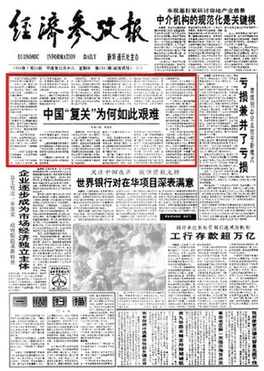 這是《經(jīng)濟(jì)參考報(bào)》的創(chuàng)刊號(hào)。在頭版《要用管理集體企業(yè)的辦法管理全民企業(yè)》一文中,時(shí)任天津市市長(zhǎng)胡啟立表示,“吃大鍋飯”的經(jīng)濟(jì)管理體制已走進(jìn)死胡同。如果用管理集體企業(yè)的辦法來(lái)管理全民企業(yè),浪費(fèi)會(huì)大大減少,國(guó)家收入會(huì)大大增加,職工生活會(huì)大大改善,這是明擺著的事情。在這個(gè)問(wèn)題上,誰(shuí)覺(jué)悟得早誰(shuí)主動(dòng);誰(shuí)還在老框框里吃“大鍋飯”,誰(shuí)就被動(dòng)。
