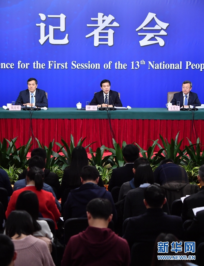 3月11日,十三屆全國(guó)人大一次會(huì)議新聞中心舉行記者會(huì),邀請(qǐng)商務(wù)部部長(zhǎng)鐘山、副部長(zhǎng)兼國(guó)際貿(mào)易談判副代表王受文、副部長(zhǎng)錢克明就“推動(dòng)形成全面開放新格局推動(dòng)商務(wù)事業(yè)高質(zhì)量發(fā)展”相關(guān)問題回答中外記者提問。 新華社記者 李鑫 攝