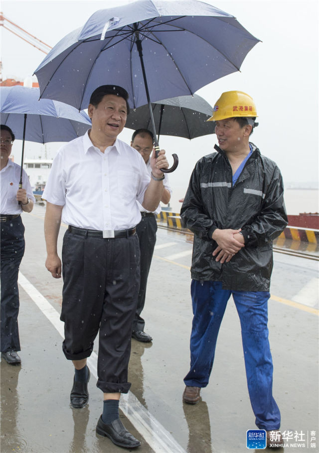 2013年7月21日上午,習(xí)近平冒雨來到武漢新港陽邏集裝箱港區(qū)考察。新華社記者 李學(xué)仁 攝