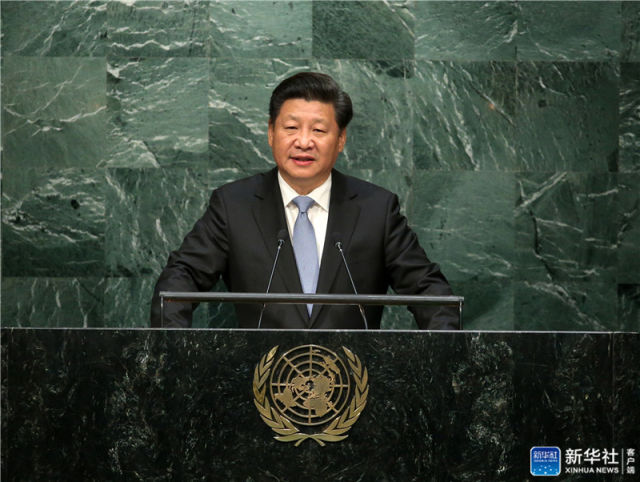 2015年9月28日,習(xí)近平在紐約聯(lián)合國(guó)總部出席第70屆聯(lián)合國(guó)大會(huì)一般性辯論并發(fā)表題為《攜手構(gòu)建合作共贏新伙伴 同心打造人類命運(yùn)共同體》的重要講話。新華社記者 龐興雷 攝