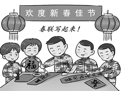無(wú)論鄉(xiāng)村還是城市,春節(jié)家家戶戶都要張燈結(jié)彩。放鞭炮、貼春聯(lián)、逛廟會(huì),其樂融融。能文能武的戰(zhàn)士們,此時(shí)也會(huì)提筆蘸墨,書寫、張貼春聯(lián)和“?!弊?,把天南海北的座座軍營(yíng)裝點(diǎn)出濃濃年味。
