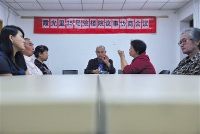 2016年5月,朝陽(yáng)區(qū)霞光里,居民在居民議事廳討論。資料圖片/新京報(bào)記者 王嘉寧 攝