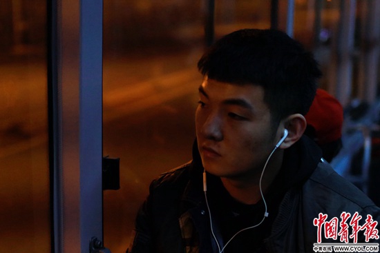 凌晨乘坐夜班車的年輕人沉浸在音樂里。?鄭萍萍攝