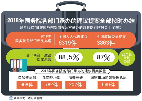新華社北京2月27日電(胡璐、張涵)2018年,國務院各部門牽頭辦理全國人大代表建議6319件,全國政協(xié)委員提案3863件,分別占“兩會”建議提案總數(shù)的88.5%和87%,已全部按時辦結(jié)。