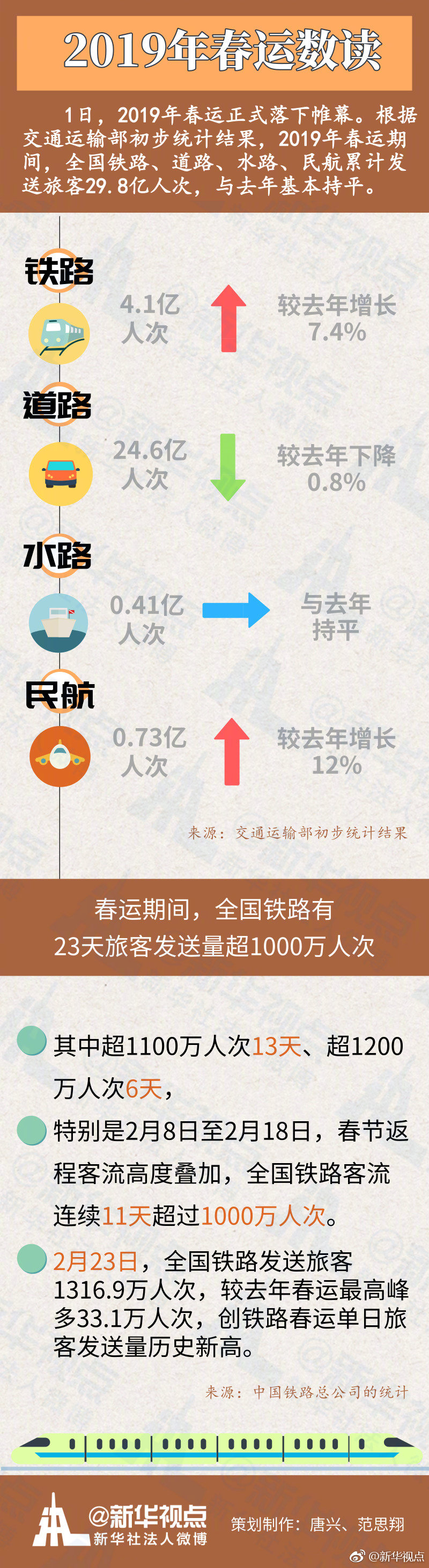 來自中國鐵路總公司的統(tǒng)計顯示,春運期間,全國鐵路有23天旅客發(fā)送量超1000萬人次,其中超1100萬人次13天、超1200萬人次6天,特別是2月8日至2月18日,春節(jié)返程客流高度疊加,全國鐵路客流連續(xù)11天超過1000萬人次。2月23日,全國鐵路發(fā)送旅客1316.9萬人次,較去年春運最高峰多33.1萬人次,創(chuàng)鐵路春運單日旅客發(fā)送量歷史新高。