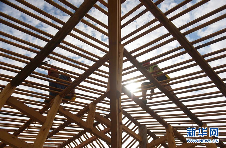 在湖北省宣恩縣曉關(guān)侗族鄉(xiāng),工人在建設(shè)吊腳樓(2018年7月26日攝)。2018年,當(dāng)?shù)卣_始修建6座新的侗寨吊腳樓,為符合易地搬遷政策的貧困戶實(shí)施搬遷。新華社發(fā)(王俊 攝)