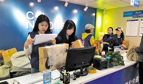 四川外國(guó)語大學(xué)綜合物流服務(wù)中心內(nèi),工作人員精準(zhǔn)記錄著快遞末端的流通信息。吉蕾蕾 攝
