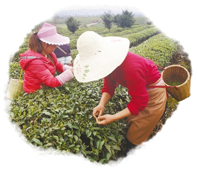 正值初春,茶海一股股綠色波浪間,采摘明前茶的身影漸漸多起來。走近些,只見茶農(nóng)兩手并用,上下翻騰,大拇指和食指準確地將茶青捏住,用力一提,手腕一甩,鮮嫩的芽便收入了斜挎背的竹簍里。切不可用指甲掐,否則破壞了細胞結(jié)構(gòu),茶青是要變黑的。