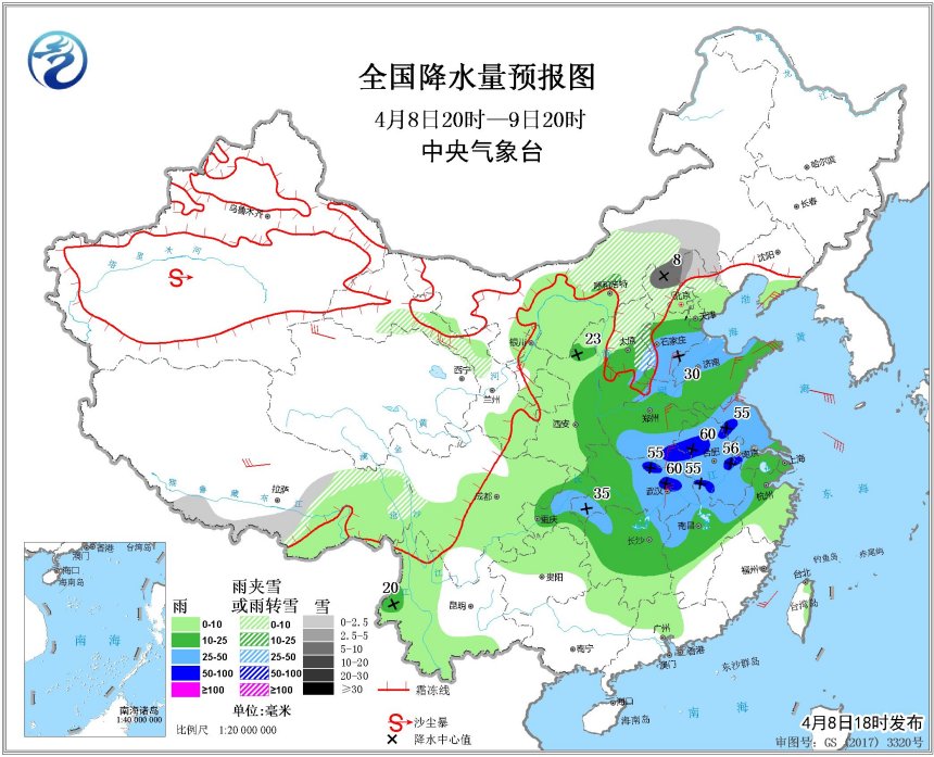 張濤:降水的主要影響時間為8日夜間到9日白天。北方地區(qū)以大范圍小到中雨的穩(wěn)定性降水為主,無雷電,影響區(qū)域主要集中在西北地區(qū)東部、內(nèi)蒙古中部、華北、黃淮等地。河北南部、河南北部、山東西部等地會達(dá)到大雨量級。除此之外,北方部分地區(qū)降水會經(jīng)過雨轉(zhuǎn)雨夾雪或雪的過程,轉(zhuǎn)化主要位置在山西北部、河南北部、北京北部等,內(nèi)蒙古中部局部地區(qū)會出現(xiàn)大雪天氣。南方的降水量相對較大,以中到大雨為主,部分地區(qū)有暴雨,江漢、黃淮南部、江淮、江南等區(qū)域會伴有雷電。河南南部和西部、安徽中北部、江蘇中北部和南部、湖北北部和南部、湖南西部等地的部分地區(qū)將有短時強降水天氣;河南南部、安徽中北部、湖北北部和東部等地的局地將有雷暴大風(fēng)或冰雹天氣。