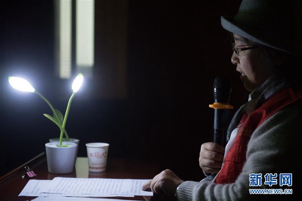 4月11日,吳素環(huán)在中國(guó)盲文圖書(shū)館桐廬縣支館為視障人士解說(shuō)電影《可可西里》。新華社記者 翁忻旸 攝