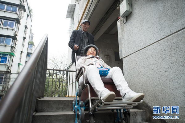 4月11日,在桐廬縣桐君街道,老伴陳洪明推著吳素環(huán)下樓前往中國(guó)盲文圖書(shū)館桐廬縣支館為視障人士解說(shuō)電影《可可西里》。新華社記者 翁忻旸 攝