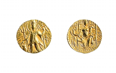 貴霜帝國伽膩色迦三世金幣 貴霜帝國伽膩色迦三世時期(約公元250—270年)鑄造,重7.9克、直徑21.5毫米 中國錢幣博物館藏