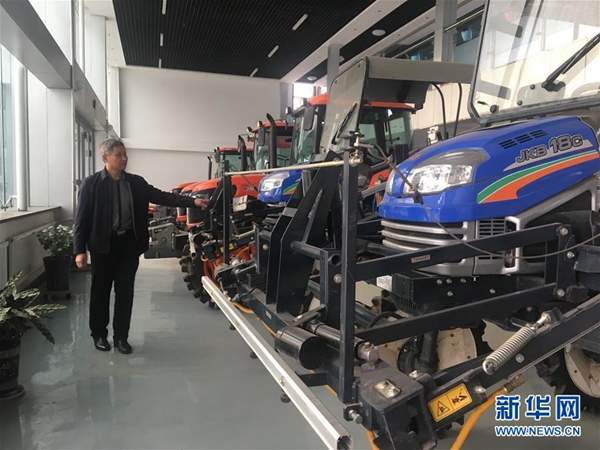 孫斌在公司查看農(nóng)機(jī)具(2月2日攝)。新華社記者 王君寶 攝