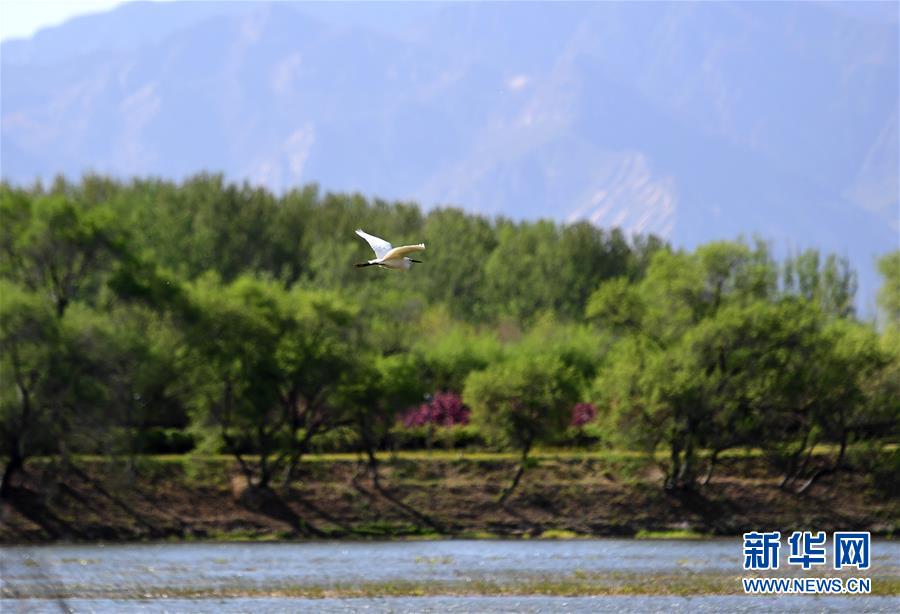 2019年4月30日,水鳥(niǎo)在媯水河畔的自然生態(tài)展示區(qū)飛翔。 新華社記者 張晨霖 攝