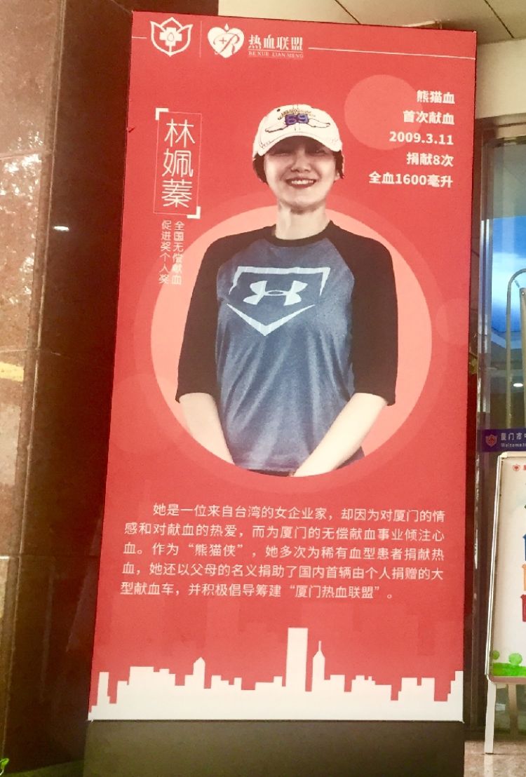 廈門市中心血站展板上宣介的是女臺商林姵蓁。她是Rh陰性血,這種血型因稀有而被稱為“熊貓血”。來自臺北的林姵蓁對無償獻血有一份執(zhí)著和擔當,這源于父親獻血幾十次的身教。她志愿成為無償為他人捐獻“熊貓血”的“熊貓俠”,在臺灣每次接到求助電話都會第一時間趕去獻血。